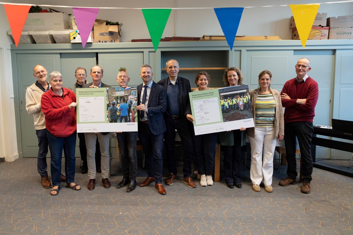 Hoewel de Dorpendeals apart zijn gemaakt, vierden we de ondertekening samen. Tijdens een vraaggesprek met wethouder Dorus Klomberg en gedeputeerde Dirk Vreugdenhil én een voorstelling van het Wijktheater Stenfert – met echte verhalen van bewoners – lieten de wijken zien waar het om gaat: samen bouwen aan een leefbaar en verbonden Dieren waar iedereen zich thuis voelt.